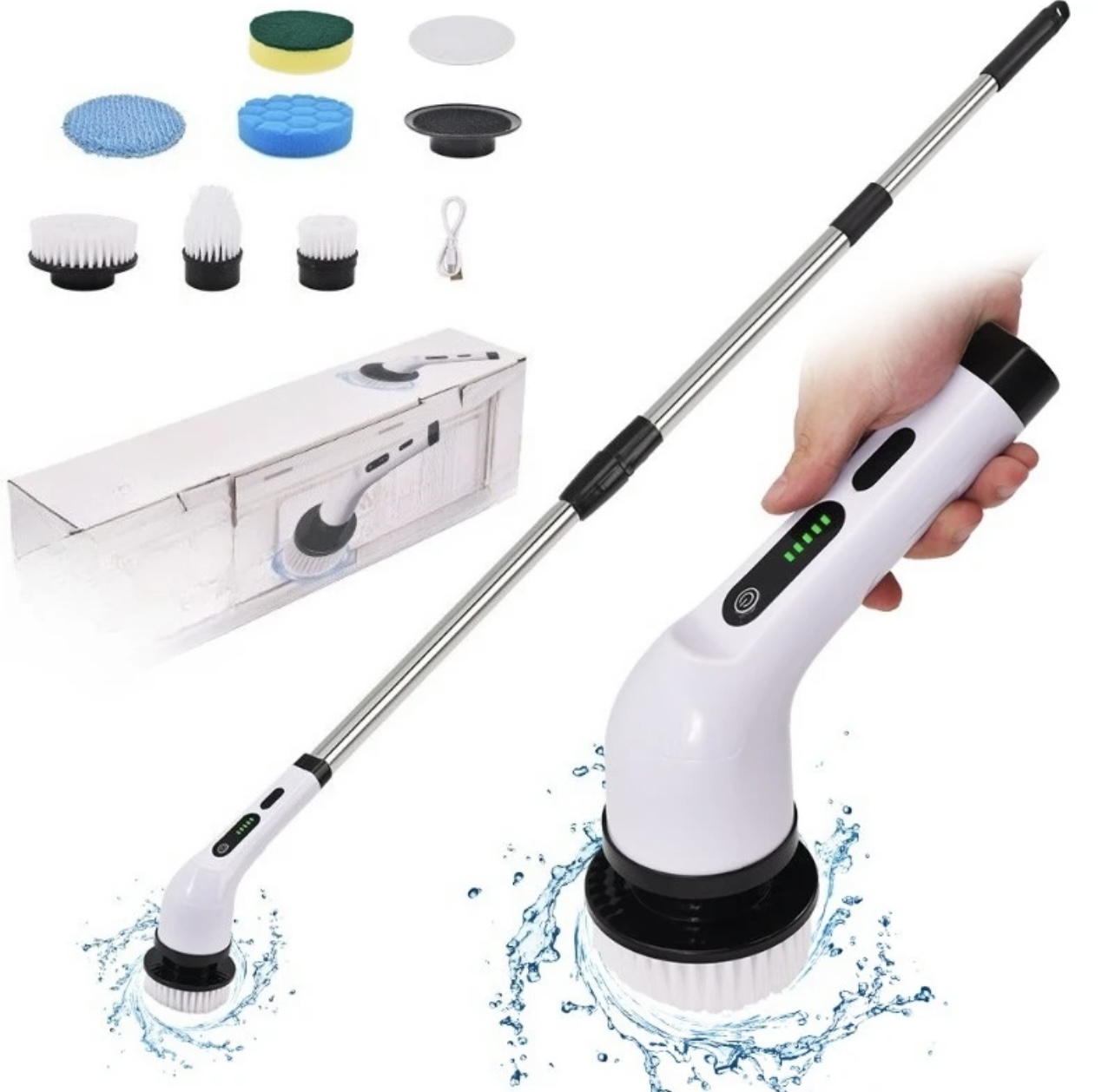 Facilite a limpeza da sua casa com esta escova elétrica multifuncional. Equipada com 9 acessórios diferentes, é ideal para higienizar a sala de estar, casa de banho, cozinha e muito mais.