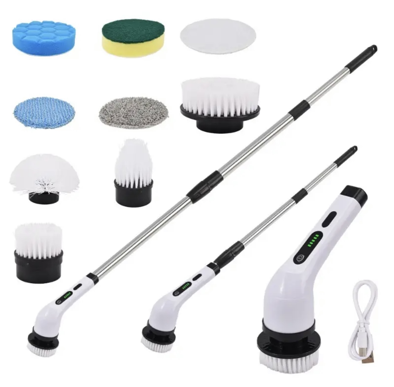 • Conjunto de escova elétrica de limpeza com cabeças variadas e haste telescópica