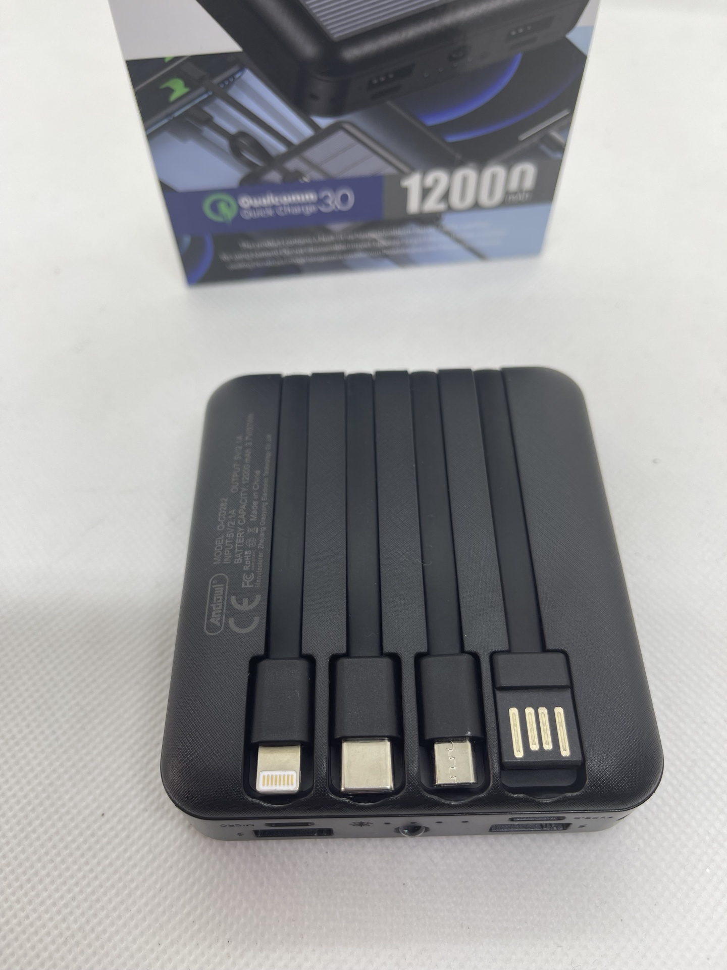 Com uma capacidade de 12000mAh, oferece carregamentos múltiplos para smartphones, tablets, auscultadores e outros dispositivos. Inclui 4 cabos integrados – USB, Lightning, Type-C e Micro USB – para máxima compatibilidade com a maioria dos aparelhos no mercado.