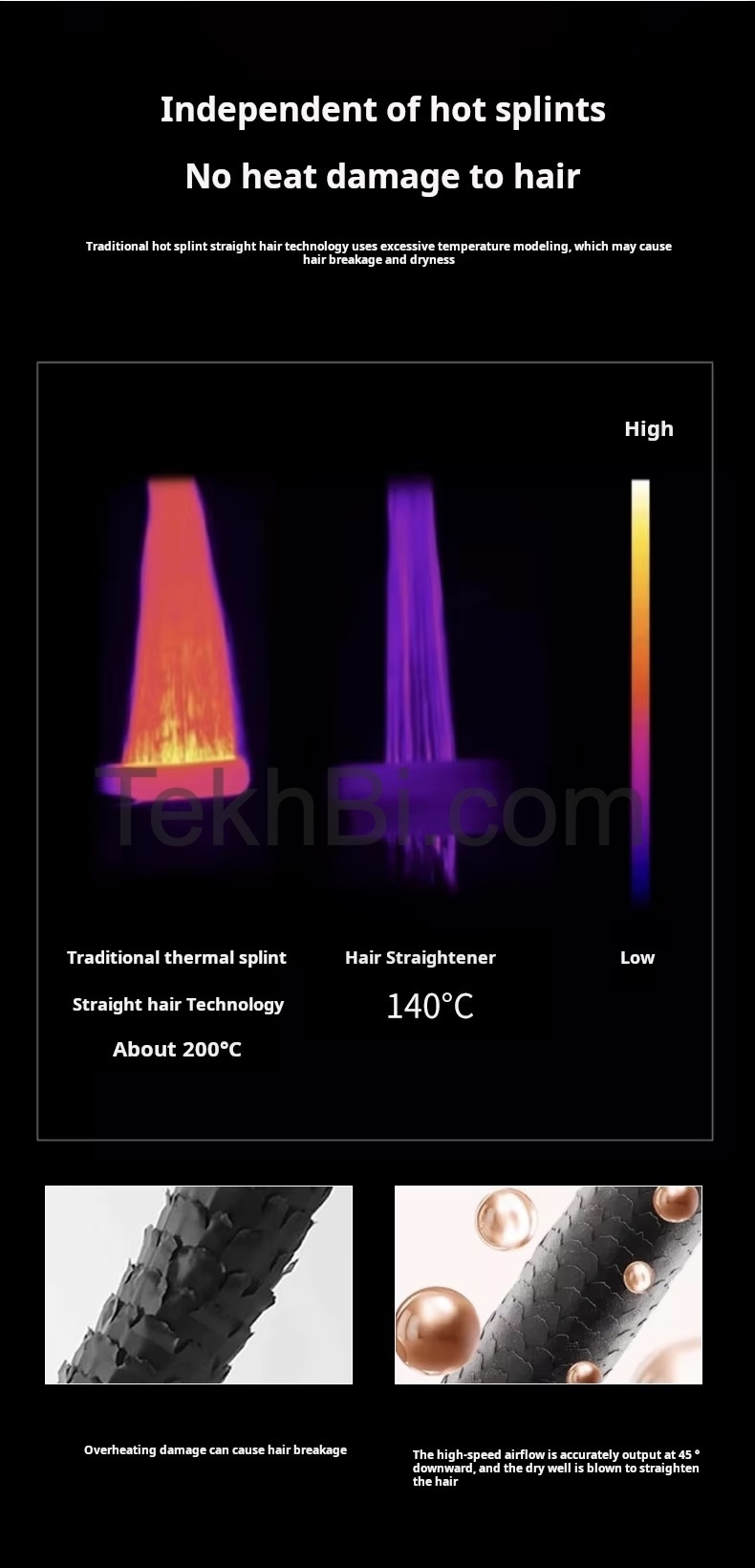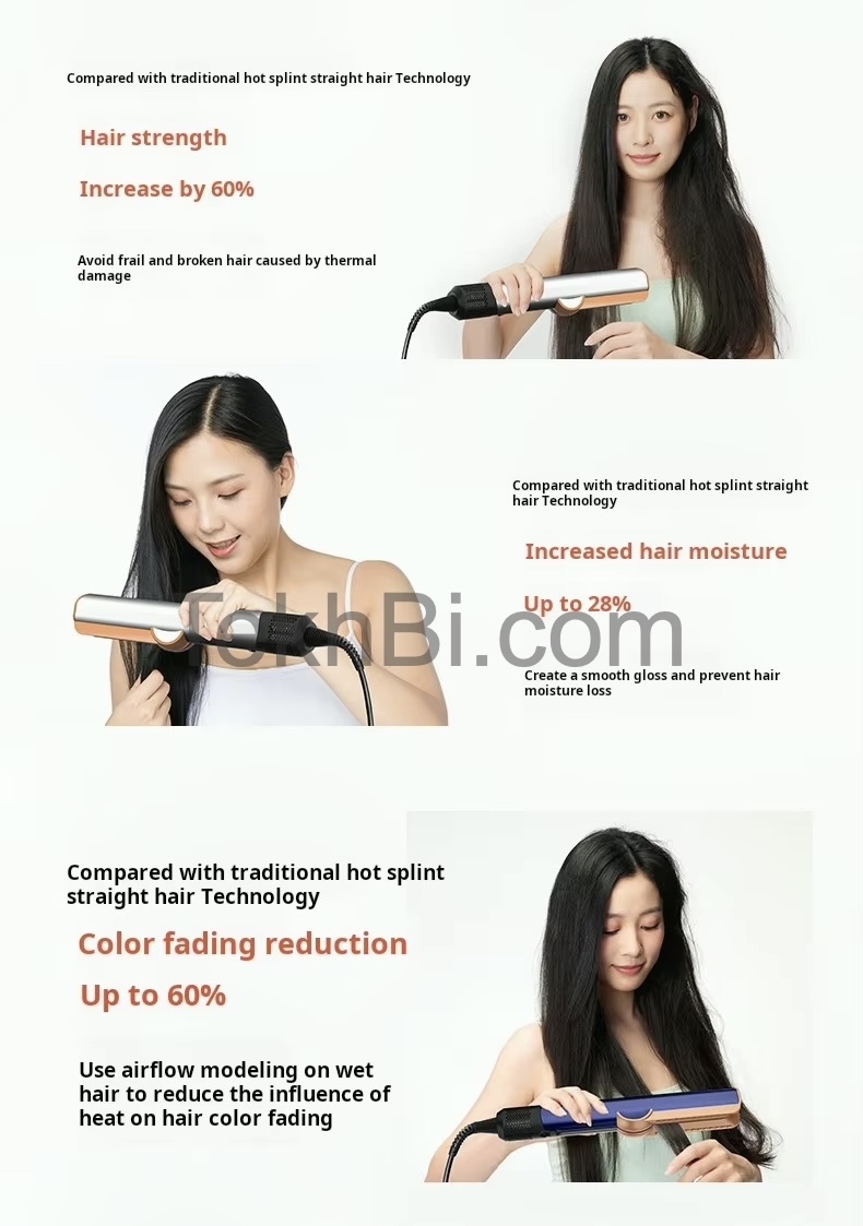 O fluxo de ar potente e controlado substitui o calor excessivo, proporcionando um alisamento eficaz, suave e uniforme. O resultado é um cabelo liso, solto, com movimento natural e um brilho saudável, tudo isto enquanto protege a estrutura e hidratação natural dos fios.